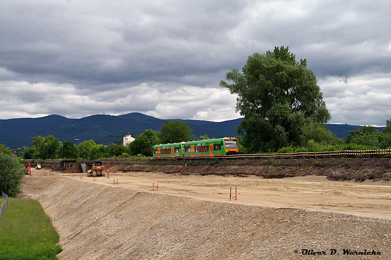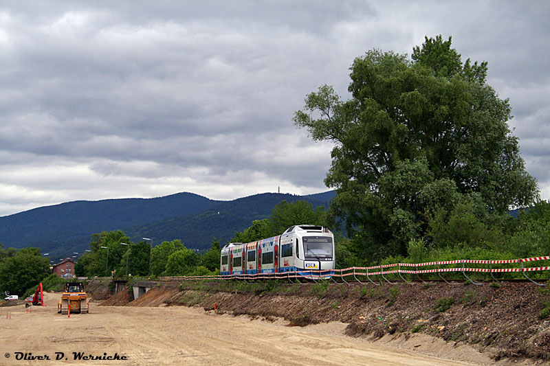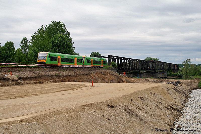 Bevor sich der ungewohnte Triebwagen der Donaustadt nähert, passiert noch ein Waldbahn-RS 1-Doppel die alte Donaubrücke und das Baufeld für die neue Brücke.