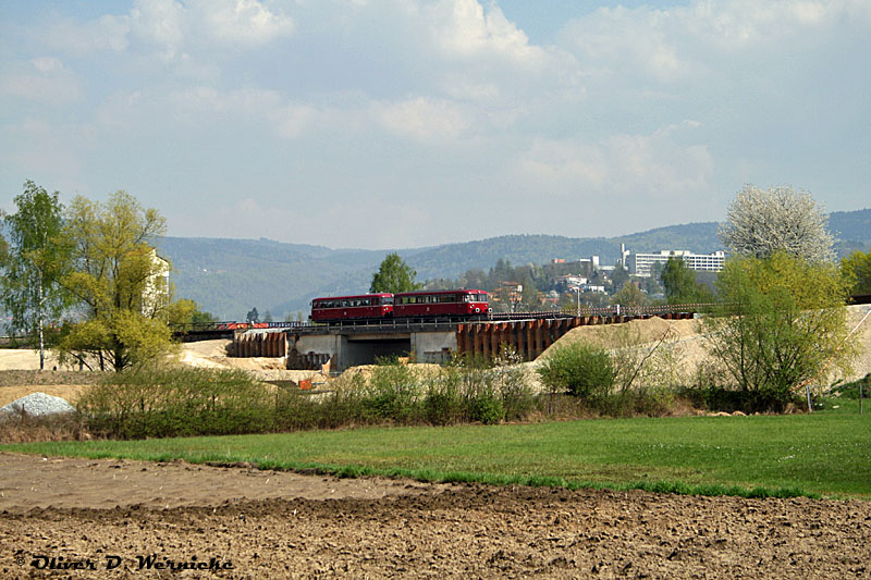 Die zweiteilige Schienenbusgarnitur passiert die Baustelle bei der Deggendorfer Donaubrücke.